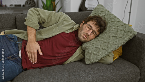 Hispanic man with beard feeling stomachache while lying on couch indoors at home.
