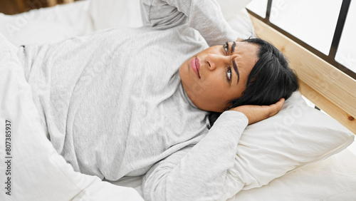 Hispanic woman covering ears while lying in bed, annoyed by noise in a bright bedroom setting.