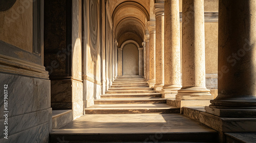 Historic staircase with columns leading to an archway, illuminated by soft light