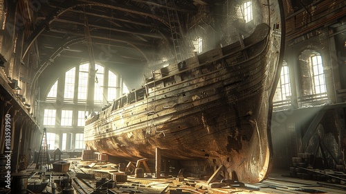 Historic Wooden Ship Restoration in Sunlit Workshop