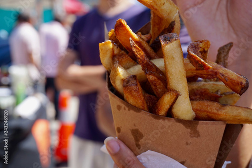 Holding french fries to go in a paper cone take out carrier, outdoors,
