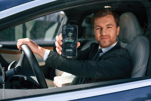 Holding smartphone with charging progress app. Businessman in suit is driving his electric car