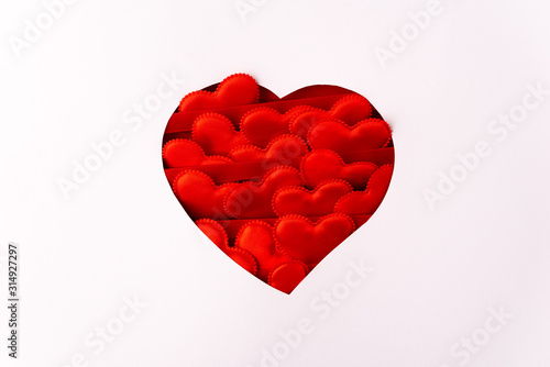 Hole in paper in the shape of a heart, textile red hearts, Valentine's day card