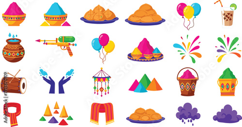 Holi Festival Icon Set with Colorful Gulal Powder, Water Gun, Balloons, Sweets, Fireworks, and Traditional Indian Celebration Elements in Bright Vector Style