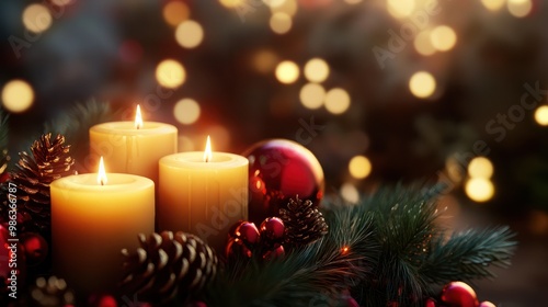 Holiday background of Christmas decorations with candles Close-Up
