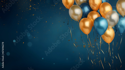 Holiday background with golden and blue metallic balloons, confetti and ribbons. Festive card for birthday party, anniversary, new year, christmas or other events.
