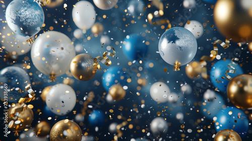 Holiday background with golden and blue metallic balloons, confetti and ribbons. Festive card for birthday party, anniversary, new year, christmas or other events
