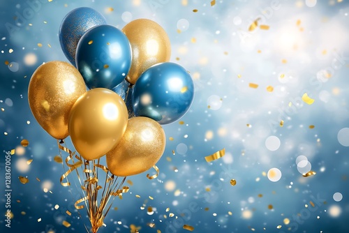 Holiday background with golden and blue metallic balloons, confetti and ribbons. Festive card for birthday party, anniversary, new year, christmas or other events. Created with generative Ai