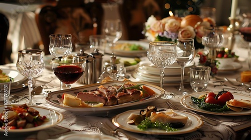 Holiday Feast: Christmas Dinner Table with Wine, Roasted Pork, and Festive Decor