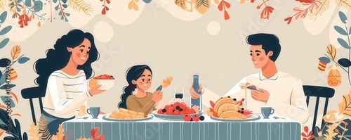 Holiday feast, family sharing gratitude, flat design illustration