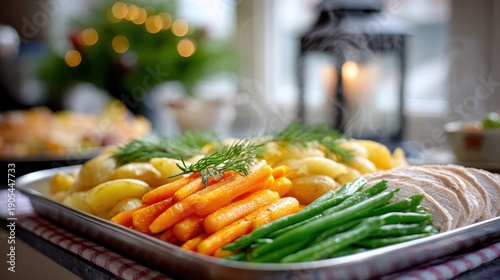 Holiday feast on metal platter with roast potatoes, carrots, and green beans