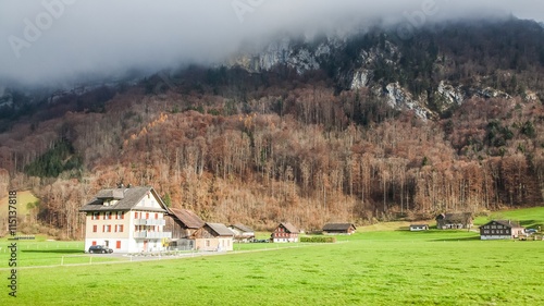 Holiday in Switzerland - Beautiful foggy view of winter landscape towards Engelberg, Switzerland