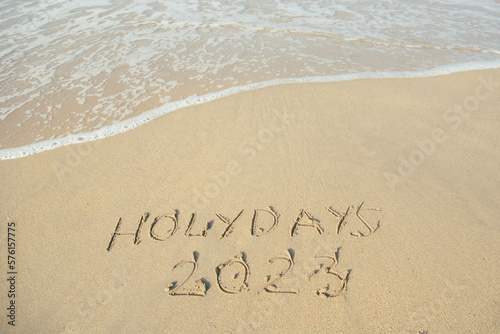 Holidays 2023 lettering on the beach with wave and clear blue sea.