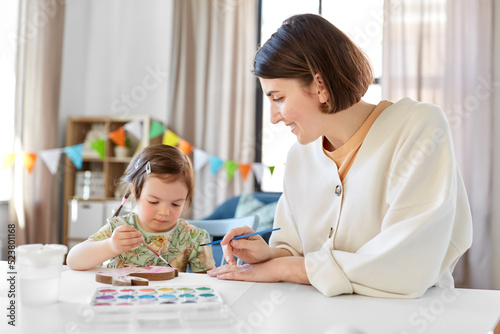 holidays, family and people concept - happy mother and little baby daughter coloring easter bunny with watercolors at home