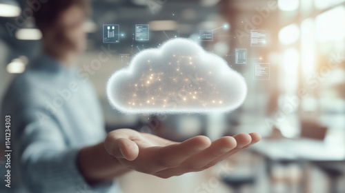 Holographic Cloud Storage Concept with Business Professional and Floating Digital Cloud