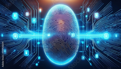 holographic fingerprint with binary code flows into it, surrounded by digital compliance tags, representing advanced security technology and identity verification