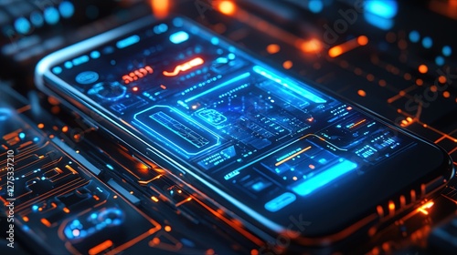 Holographic smartphone interface, sleek and futuristic, neon blue glow