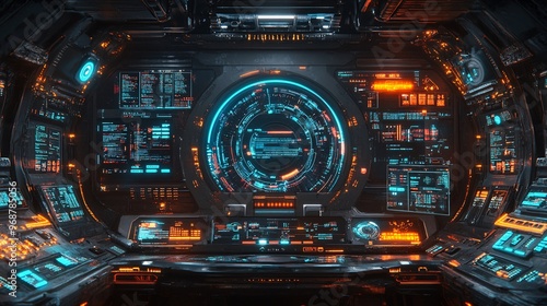 Holographic user interface with floating transparent buttons and data screens in a futuristic environment abstract interaction elements enhancing the digital experience Large space for text in center