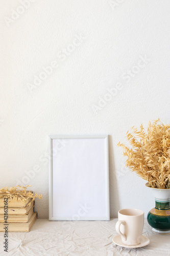 Home decor mock-up, blank picture frame near white painted concrete wall ,vase with dried yellow oat stalks, old books and a cup of coffee