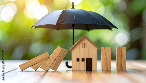 Home Insurance Concept Umbrella Protecting House from Falling Dominoes Risk Protection