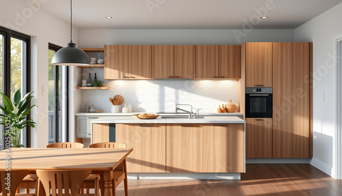 Home kitchen interior with eating table, bar island and cabinet. Mockup wall isolated with white highlights, png