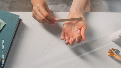 Home Manicure Process with Nail File on Table