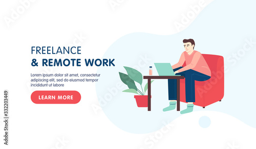Home office workplace landing page design. Freelance or remote work design concept. Male freelancer working remotely from his laptop in the chair. Vector flat cartoon illustration