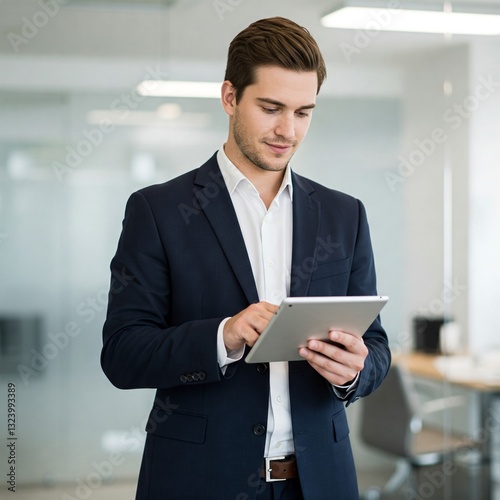 Homem feliz, segurando um tablet em seu ambiente de trabalho