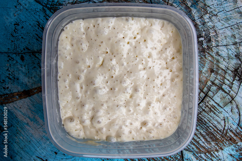 homemade sourdough on wheat flour in a plastic container