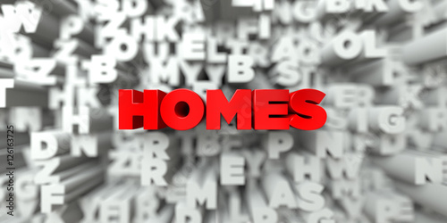 HOMES - Red text on typography background - 3D rendered royalty free stock image. This image can be used for an online website banner ad or a print postcard.