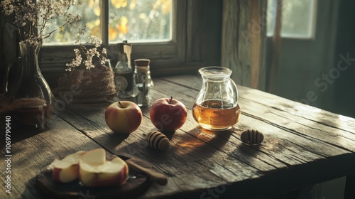 Honey and apples on a wooden table, traditional snack, rustic and cozy scene
