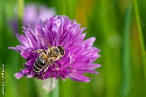 Honey bee collecting nectar from chives plant blossom. Chives are a commonly used herb for culinary purposes.