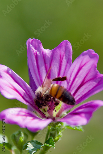 Honeybee collecting pollen inside a vibrant purple mallow flower, macro closeup showing fine details of petals, pollen grains, and the ecological importance of pollinators.