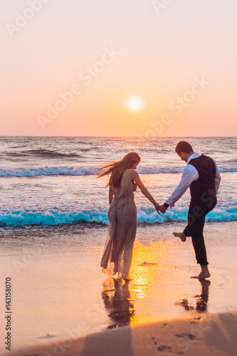 Honeymoon couple romantic in love at beach sunset. Newlywed happy young couple holding hands enjoying ocean sunset during travel holidays vacation getaway.
