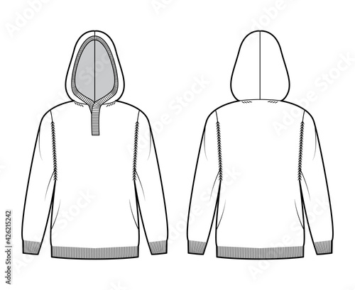 Hooded Sweater technical fashion illustration with rib henley neck, long sleeves, oversized, hip length, knit rib trim. Flat jumper apparel front, back, white color style. Women, men unisex CAD mockup