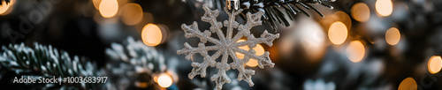 Horizontal Close-Up of a Snowflake Ornament Hanging on a Christmas Tree Branch with Soft, Out-of-Focus Christmas Lights in the Background, Capturing the Festive Spirit and Holiday Cheer.
