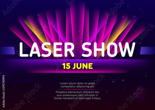 Horizontal laser show poster with bright color graphic elements, dark background and text.