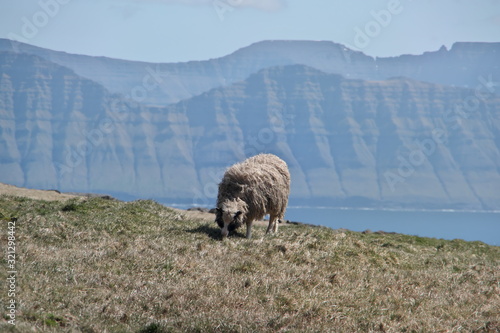 Horizontal scenery image of Faroese landscape with beautiful mountains and the North Atlantic Ocean in distant background and sheep on the foreground. View from Slættaratindur hiking trail