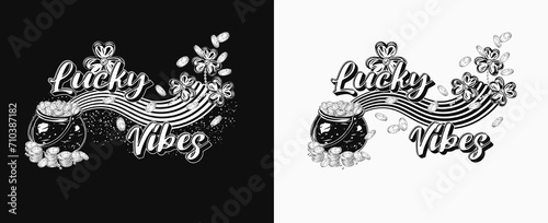 Horizontal St Patricks Day label with rainbow wave, pot full of gold treasures, clover, flying coins, text Lucky Vibes. For prints, clothing, t shirt, holiday stuff design. Vintage style