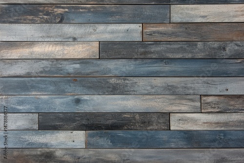 Horizontal wood plank wall paneling. Wooden planks in various shades of gray and blue. Visible wood grain