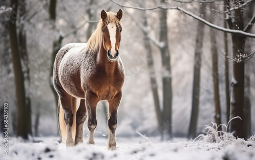 Horse in forest during snowfall, atmospheric winter view