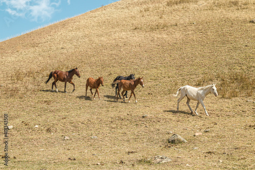 Horses descend from the mountain in nature
