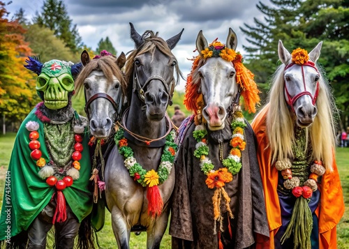 Horses dressed up as monsters and creatures for a spooky Halloween party
