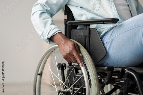 Hospital for service patient and disabled people. Medical equipment in clinic for assistance handicapped people. African american man in chair with wheels for patient care at home, focus on hand
