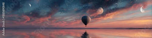 Hot air balloon at sunset over tranquil water with dramatic sky and crescent moons