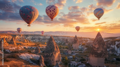 Hot Air Balloons Flying Over Cappadocia Landscape at Sunset Time