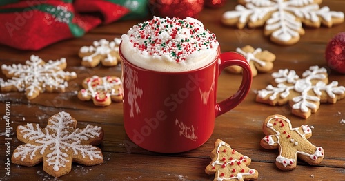 Hot chocolate, coffee in a cup, with Christmas snowflakes, beautiful cover. Christmas premium background image, for cover, brochure, brochure, desktop, notepad. Concept for holiday.