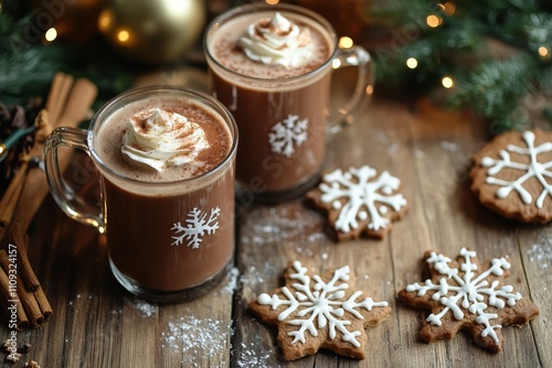 Hot Chocolate with Whipped Cream and Cinnamon in Glass Mugs. AI generated illustration