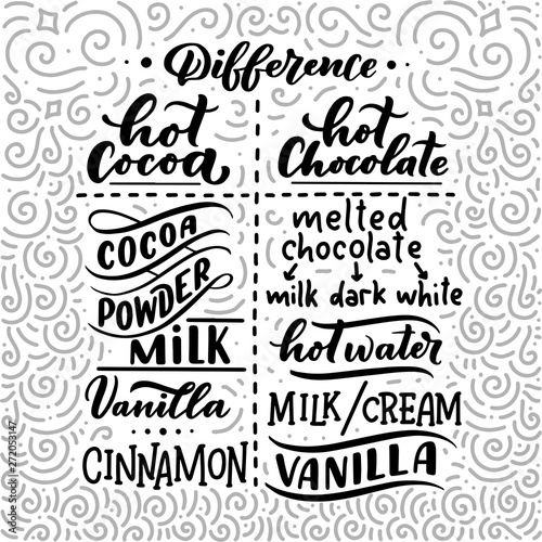 Hot cocoa and hot chocolate difference, hand lettering composition. Hand drawn recipe for Christmas signs, menu, cafe, bar and restaurant