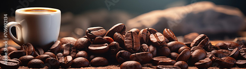 Hot cup of coffee. Freshly roasted coffee beans close up on a dark background
